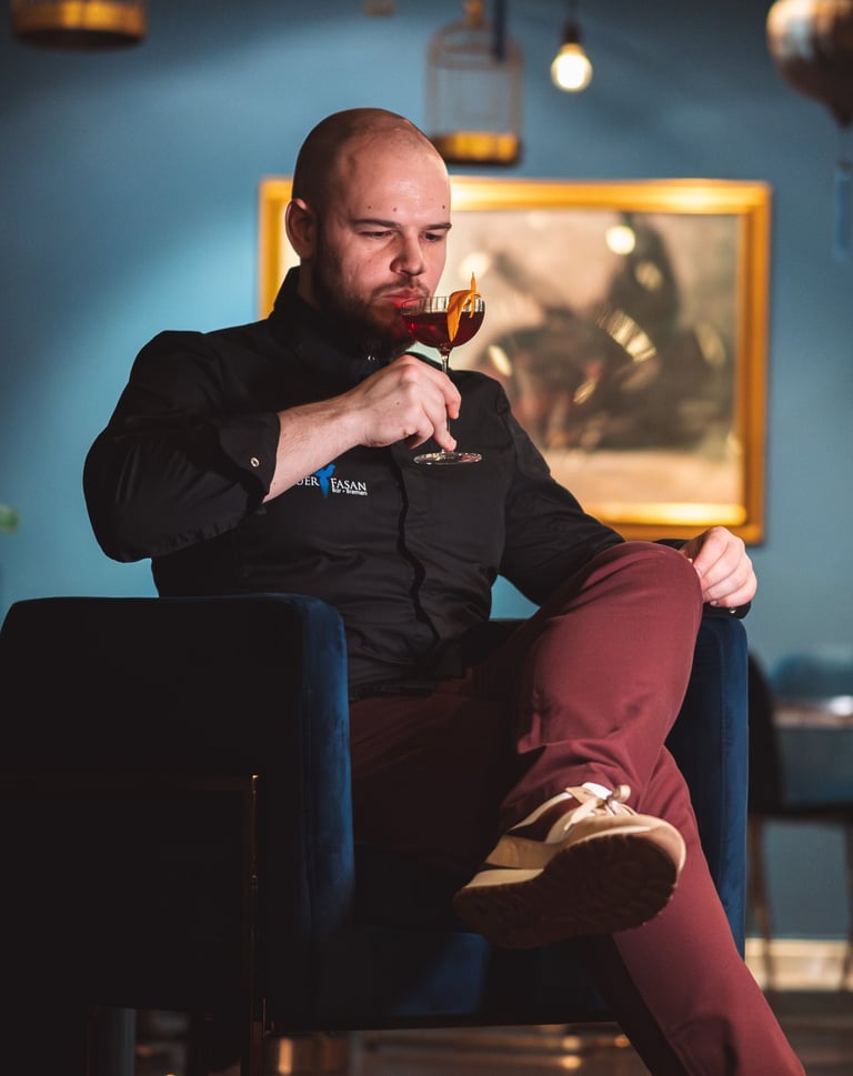 Bartender Portrait dokumentiert Tims Arbeit in der @blauerfasanbar.
